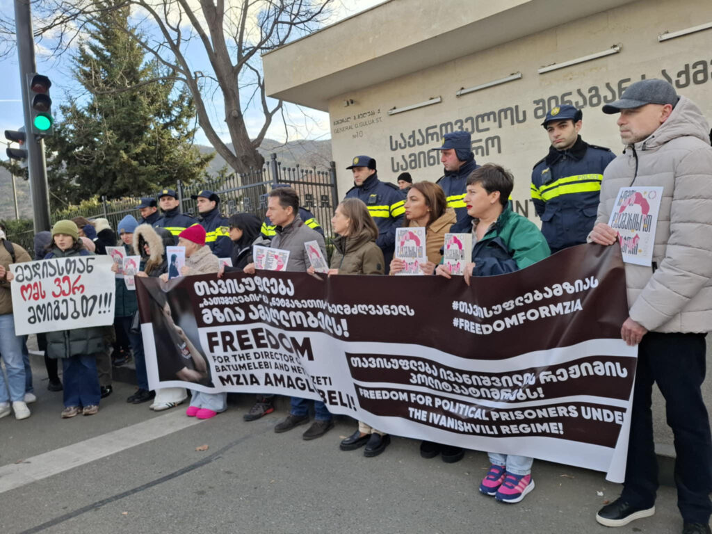 შინაგან საქმეთა სამინისტროს შენობის წინ ჟურნალისტები, მზია ამაღლობელის მხარდასაჭერ საპროტესტო აქციას მართავენ.