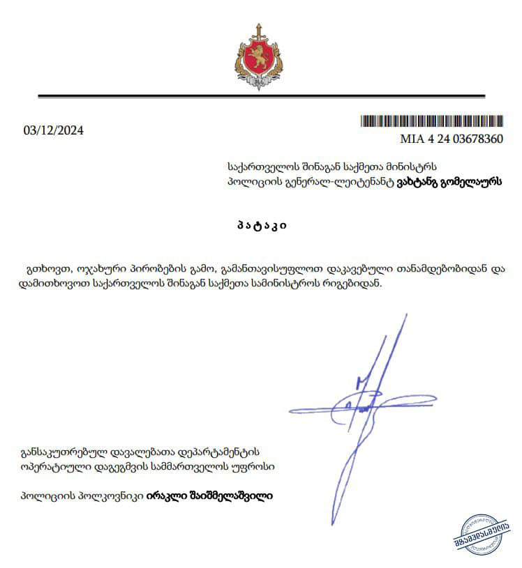 „გთხოვთ, ოჯახური პირობების გამო გამათავისუფლოთ დაკავებული თანამდებობიდან და დამითხოვოთ საქართველოს შინაგან საქმეთა სამინისტროს რიგებიდან“, – წერს პატაკში შაიშმელაშვილი.