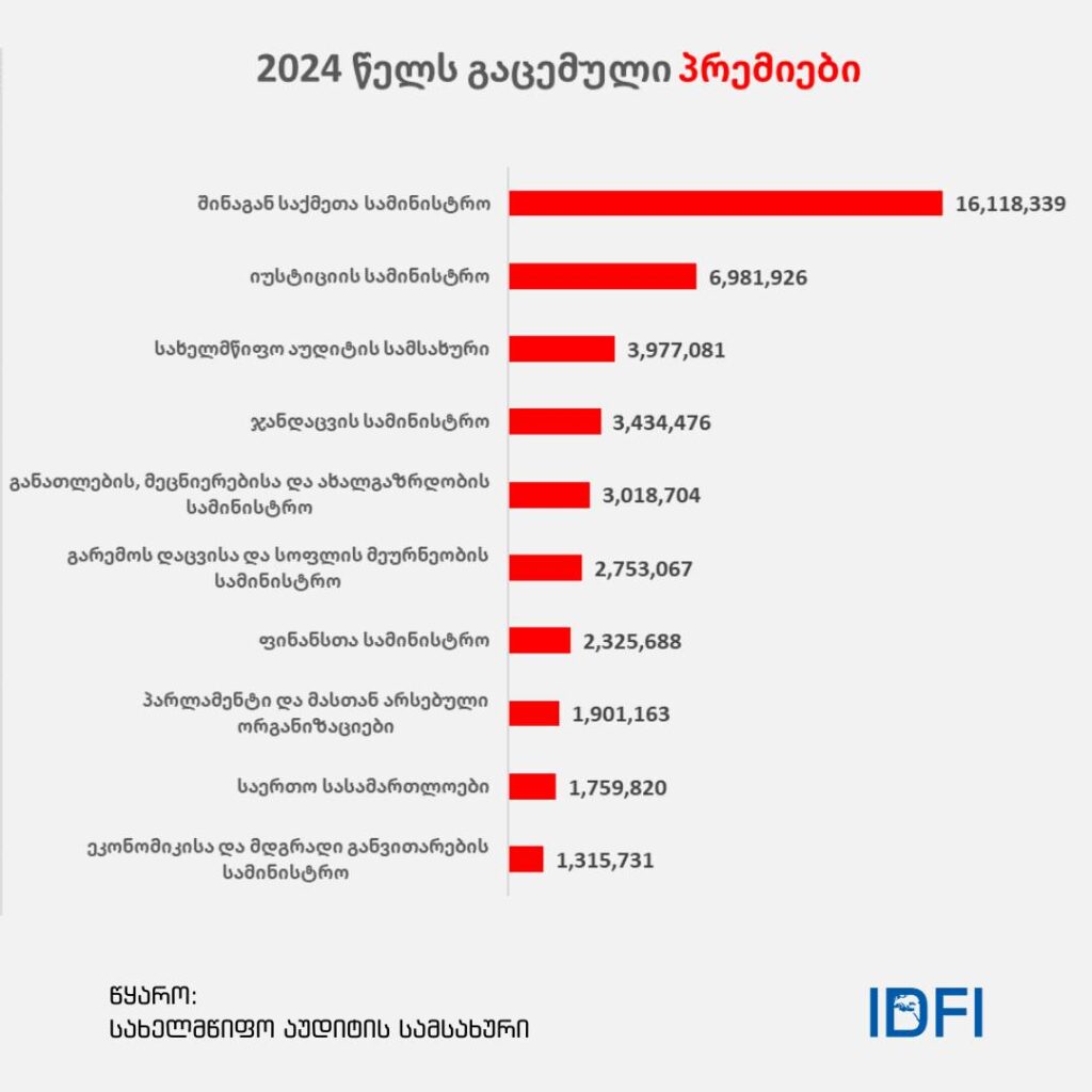 “გაცემული პრემია/დანამატების სიდიდით გამოირჩევიან ისეთი უწყებები (სასამართლოები, ძალოვანი უწყებები), რომლებზეც არ ვრცელდება კანონით დადგენილი შეზღუდვები პრემია-დანამატებზე”, – აცხადებენ IDFI-ში.