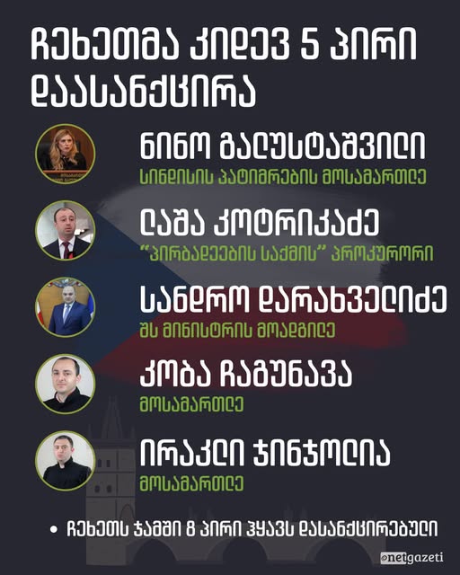 ჩეხეთის საგარეო საქმეთა სამინისტროს ცნობით, დასანქცირებული „საქართველოს რეჟიმის ხუთი წარმომადგენელი – შინაგან საქმეთა მინისტრის მოადგილე, სამი მოსამართლე და ერთი პროკურორი“.