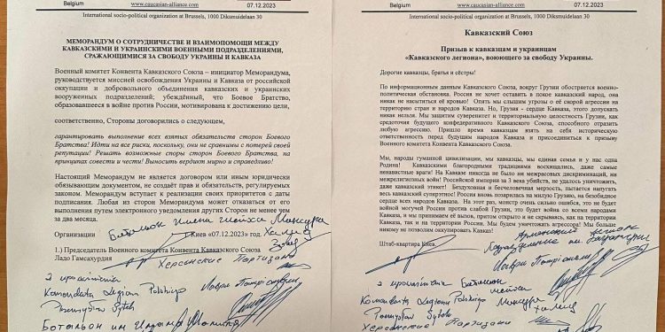 🔘 “კავკასიის კავშირის” მემორანდუმი (ფოტოზე მარცხნივ)-მიღებულია კიევში 2023 წლის 7 დეკემბერს, ხელმოწერილია კავკასიის კავშირის კონვენტის სამხედრო კომიტეტის თავმჯდომარის ლადო გამსახურდიასა და “კავკასიის ლეგიონში” შემავალი ყველა სამხედრო ჯგუფის, მათ შორის სომხური, აზერბაიჯანული, ჩეჩნური და სხვა ბატალიონების მიერ. 🔘 მემორანდუმის ინიციატორია კავკასიის კავშირის კონვენტის სამხედრო კომიტეტი და მემორანდუმის თანახმად, “კავკასიის” ლეგიონში” შემავალი ყველა შენაერთი იღებს პასუხისმგებლობას ურთიერთთანამშრომლობისა და თანადგომის შესახებ, მხედრული ღირსების შესაბამისად და მთავარ მიზნად დასახელებულია უკრაინისა და კავკასიის თავისუფლებისთვის ბრძოლა და რუსული აგრესიისგან ერთობლივი თავდაცვა. 🔘 “კავკასიის კავშირის” კონვენტის სამხედრო კომიტეტის მოწოდება უკრაინის თავისუფლებისთვის მებრძოლი “კავკასიის ლეგიონის” კავკასიელი და უკრაინელი წევრებისადმი (ფოტოზე მარჯვნივ): ❗️ძვირფასო კავკასიელებო, დებო და ძმებო! ❗️”კავკასიის კავშირის” ხელთ არსებული ინფორმაციის თანახმად, მწვავდება სამხედრო-პოლიტიკური მდგომარეობა საქართველოს ირგვლივ: რუსეთს არ სურს კავკასიელი ხალხისთვის სიმშვიდე, ის ვერასდროს გაძღება მათი სისხლით!