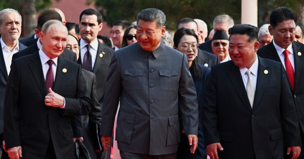 ეს საუბარი შედგა რამდენიმე წუთით ადრე, სანამ სი ძინპინი ჩინეთის მიერ იაპონიის დამარცხებაზე სიტყვას წარმოთქვამდა. კადრში ჩანან სამივე ქვეყნის ლიდერები და მათ უკან მდგომი თარჯიმნები.