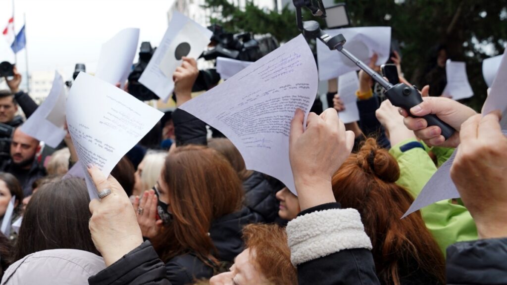 „განცხადება მინდა შევიტანო, განცხადება“, – მიმართავდა ქალი პოლიციელებს, რომლებიც აქციის მონაწილეებს ცესკოს თანამშრომლის გამოჩენამდე შენობაში შესვლის უფლებას არ აძლევდნენ.