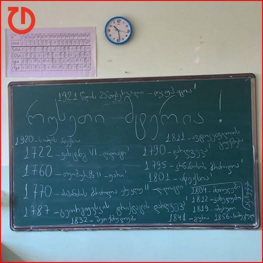 წარწერა სასკოლო დაფაზე ისტორიის და სამოქალაქო განათლების მასწავლებელმა, ანა თვაურმა გააკეთა