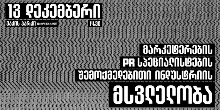 “13 დეკემბერს, 14:30-ზე მარკეტერების, PR სპეციალისტების და სრულიად შემოქმედებითი ინდუსტრიის წარმომადგენლების მსვლელობა ვაკის პარკის მთავარი შესასვლელიდან პარლამენტისკენ გაიმართება“, – აღნიშნულია ინფორმაციაში.