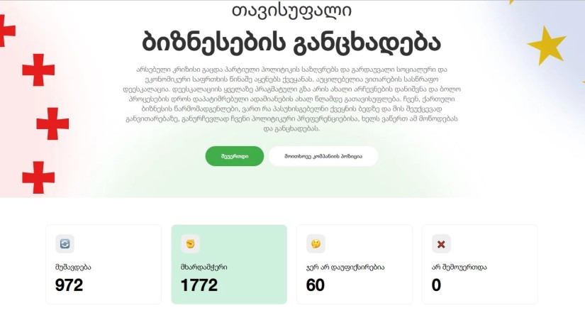 უკვე 1772-მდე გაიზარდა იმ კომპანიების რიცხვი, რომლებიც ახალი არჩევნების დანიშვნას და დაკავებულების ახალ წლამდე გათავისუფლებას ითხოვს. სწორედ ამდენი კომპანია უერთდება დაფუძნებიდან მეექვსე დღეს freebusiness.ge-ზე შესაბამის მოთხოვნებს. ჩამონათვალში კი არაერთ სექტორში მომუშავე სხვადასხვა ზომის ბიზნესია.