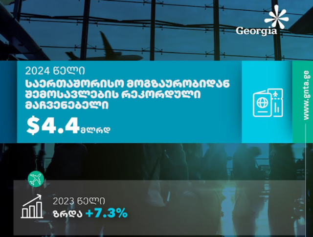 საერთაშორისო მოგზაურობიდან შემოსავლების ახალი რეკორდული მაჩვენებელი 4.4 მილიარდი დოლარი დაფიქსირდა. გასულ წელს საქართველომ 4,425,376,937 აშშ დოლარი მიიღო. 2024 წელს ტურიზმიდან მიღებულმა შემოსავლებმა 2019 წლის დონეს 35.4%-ით, (1,156,722,868 აშშ დოლარით) ხოლო 2023 წლის მონაცემებს +7.3%-ით (300,047,994 აშშ. დოლარით). გადააჭარბა.