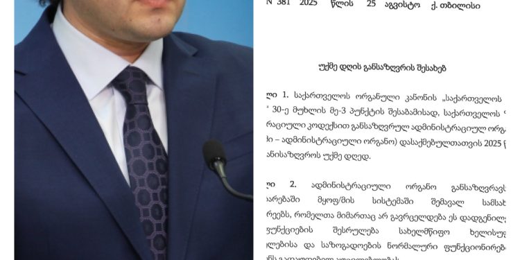 29 აგვისტო, ადმინისტრაციულ ორგანოებში დასაქმებული პირებისთვის უქმე დღედ გამოცხადდა – ამის შესახებ ნათქვამია 25 აგვისტოს გამოცემული დადგენილებით, რომელსაც ხელს ირაკლი კობახიძე აწერს.
