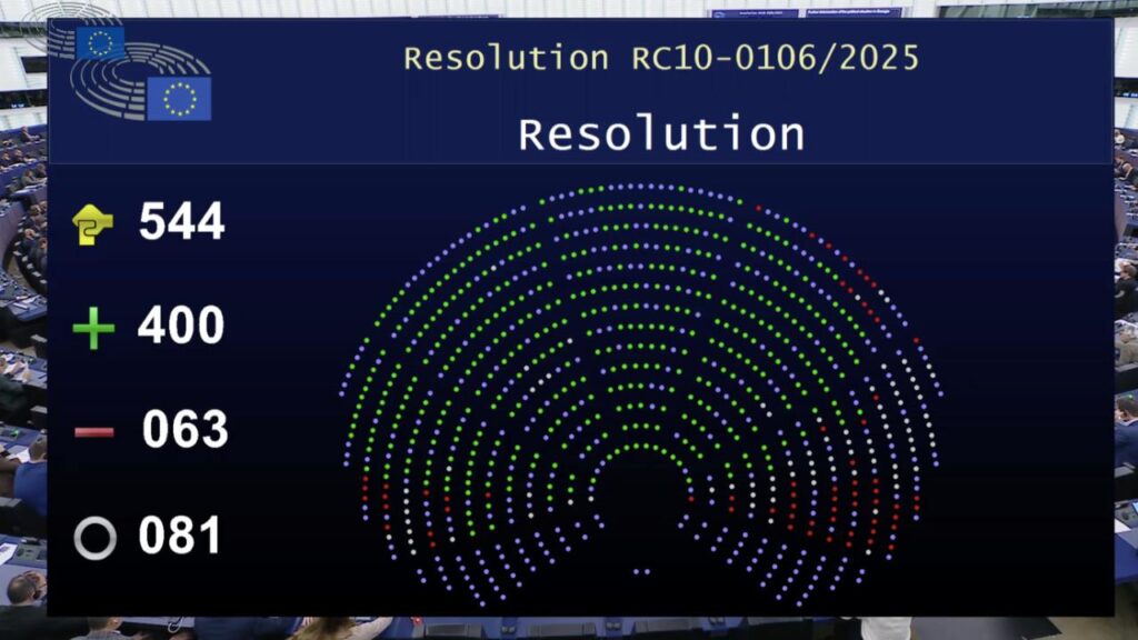 ევროპარლამენტმა 400 ხმით, 63-ის წინააღმდეგ მიიღო კრიტიკული რეზოლუცია საქართველოში პოლიტიკური სიტუაციის გაუარესების შესახებ.