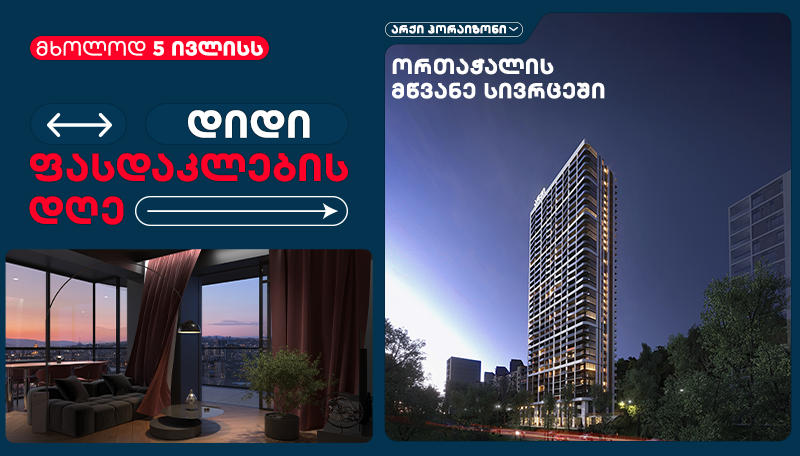 მხოლოდ 1 დღით, მხოლოდ 5 ივლისს, არქის პრემიუმ პროექტში ბინის შეძენის მსურველებს კომპანია დიდ ფასდაკლებას სთავაზობს. შეთავაზების ფარგლებში, არქის ფილარმონიის ოფისში დაინტერესებულ პირებს საშუალება ექნებათ შეზღუდული დროით – მხოლოდ ერთი დღის განმავლობაში შეიძინონ საოცნებო ბინა ისეთ ფასად, რომელიც აღარ განმეორდება.