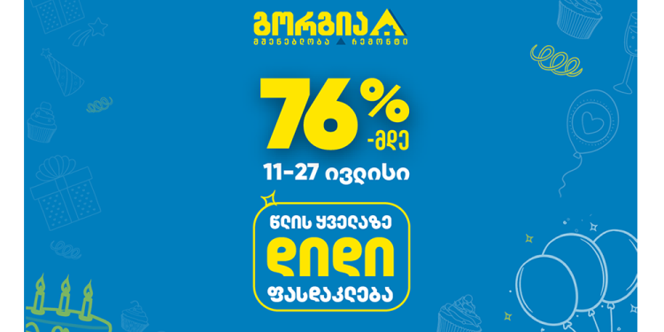 ,,გორგია’’ 27 წლისაა. დაბადების დღესთან დაკავშირებით მომხმარებლებს ჰიპერმარკეტში 76%–მდე ფასდაკლება დახვდებათ. აქცია მოქმედებს ისეთ კატეგორიებზე, როგორებიცაა: გათბობა/გაგრილება, ტექნიკა, საყოფაცხოვრებო, ფილები, ავეჯი, კარი, იატაკი, ბაღი, განათება, ხელსაწყოები.