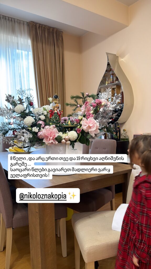 19 დეკემბერს ნიკოლოზი რომ გავიცანი, 9 დღეში სხვადასხვა ფერის 7 თაიგული გამომიგზავნა. ახლაც ასეა, საჩუქარს რომ მიკეთებს, აუცილებლად აზრს დებს. ამ თაიგულებში ყველა ფერი იყო თავმოყრილი, რაც ასე იკითხებოდა – ყველაფერი. უცებ, დიდი ტალღით შემოვიდა. ყველაზე მეტად ის მახარებდა, რომ მამასთან ჰქონდა არაჩვეულებრივი ურთიერთობა, ძალიან მეგობრობდნენ, რაც ჩემთვის სტიმული იყო…“