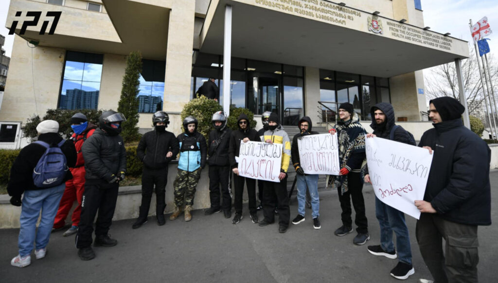 ოკუპირებული ტერიტორიებიდან დევნილთა, შრომის, ჯანმრთელობისა და სოციალური დაცვის სამინისტროსთან კურიერები მიმდინარე აქციების დროს დაკავებული პირების მხარდასაჭერად შეიკრიბნენ. მათ დაკავებული კურიერის მხარდამჭერი ბანერი აქვთ მოტანილი: „თავისუფლება ირაკლის“.