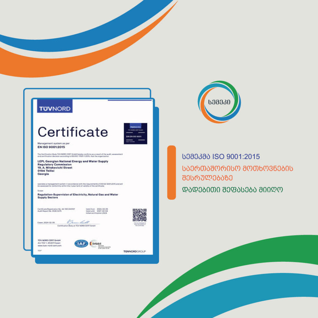 „საქართველოს ენერგეტიკისა და წყალმომარაგების მარეგულირებელი ეროვნული კომისიის (სემეკ) მიერ საქმიანობის ხარისხის მართვის სისტემა ISO 9001:2015 საერთაშორისო სტანდარტის მოთხოვნებთან სრულ შესაბამისობაშია“, – ამის შესახებ ხარისხის მენეჯმენტის სისტემის საერთაშორისო ორგანიზაციის “TÜV NORD CERT GMBH“-ის მიერ ჩატარებულ გარე საერთაშორისო აუდიტის დასკვნაშია აღნიშნულია.