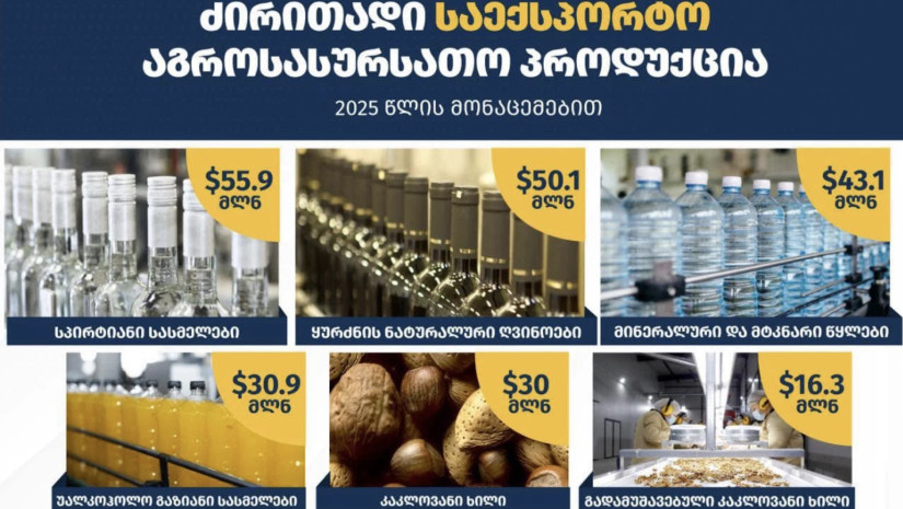 2025 წლის მონაცემებით ძირითადი საექსპორტო პროდუქციაა სპირტიანი სასმელები (55.9 მლნ აშშ დოლარი), ყურძნის ნატურალური ღვინოები (50.1 მლნ აშშ დოლარი), მინერალური და მტკნარი წყლები (43.1 მლნ აშშ დოლარი), უალკოჰოლო გაზიანი სასმელები (30.9 მლნ აშშ დოლარი), კაკლოვანი ხილი (30 მლნ აშშ დოლარი) და გადამუშავებული კაკლოვანი ხილი (16.3 მლნ აშშ დოლარი).
