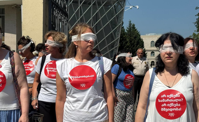 ადგილზე შეკრებილ აქციის მონაწილეებს თვალები აქვთ ახვეული და სხვადასხვა წარწერებით, მათ შორის: „მოგეკითხებათ“, „დაბრმავებული სამართალი“, „უდანაშაულოა“, „არ იქნება სამართალი, არ იქნება მშვიდობა“ მაისურები აცვიათ.