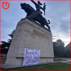 “ნაომარი ქალაქი ბოდიშს არ იხდის!” – ბანერი გორში, მზეჭაბუკის ძეგლთან