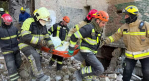 კიევში, რუსეთის მიერ განხორციელებული სარაკეტო დარტყმის შედეგად დანგრეული ცხრასართულიანი შენობის