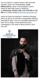 30 ოქტომბერს, ბოსტონის კონსერვატორიაში, ლაშა მძინარაშვილი ქორეოგრაფიული პროგრამის მიმართულების სტუდენტებთან