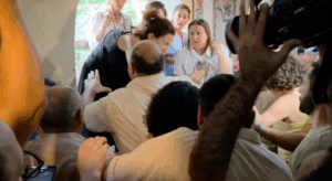 თბილისის საქალაქო სასამართლოში ხმაურია. მანდატურს მოქალაქეები შენობიდან ძალის გამოყენებით გაყავს.