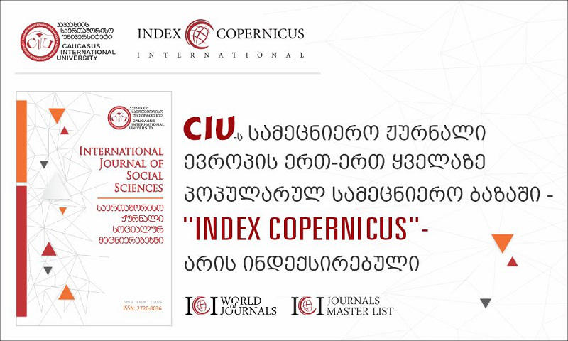 კავკასიის საერთაშორისო უნივერსიტეტის სამეცნიერო ჟურნალი „საერთაშორისო ჟურნალი სოციალურ მეცნიერებებში” (International Journal of Social Sciences, IJSS https://journal.ciu.edu.ge/) ევროპის ერთ-ერთ ყველაზე პოპულარულ სამეცნიერო ბაზაში – “Index Copernicus” – არის ინდექსირებული. ჟურნალი წარმოდგენილია აღნიშნული სამეცნიერო ბაზის Master list-სა და World List-ში, – ამის შესახებ ინფორმაციას კავკასიის საერთაშორისო უნივერსიტეტი ავრცელებს.