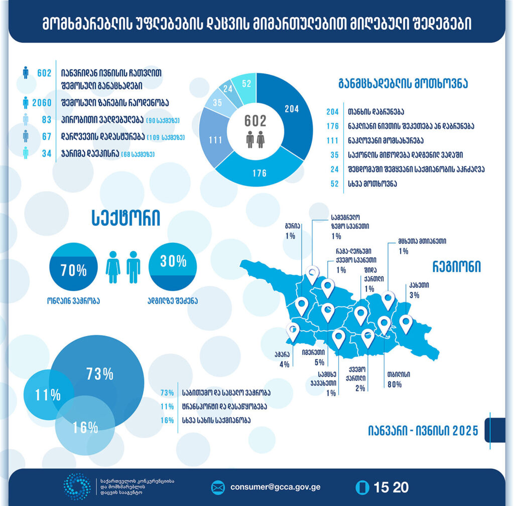 საქართველოს კონკურენციისა და მომხმარებლის დაცვის სააგენტოში (GCCA), მომხმარებლის უფლებების დაცვის მიმართულებით, 2025 წლის ექვს თვეში – 602 განაცხადი დაფიქსირდა, ხოლო შემოსული ზარების რაოდენობამ 2060 შეადგინა. აღნიშნულის შესახებ ინფორმაციას საქართველოს კონკურენციისა და მომხმარებლის დაცვის სააგენტო ავრცელებს.
