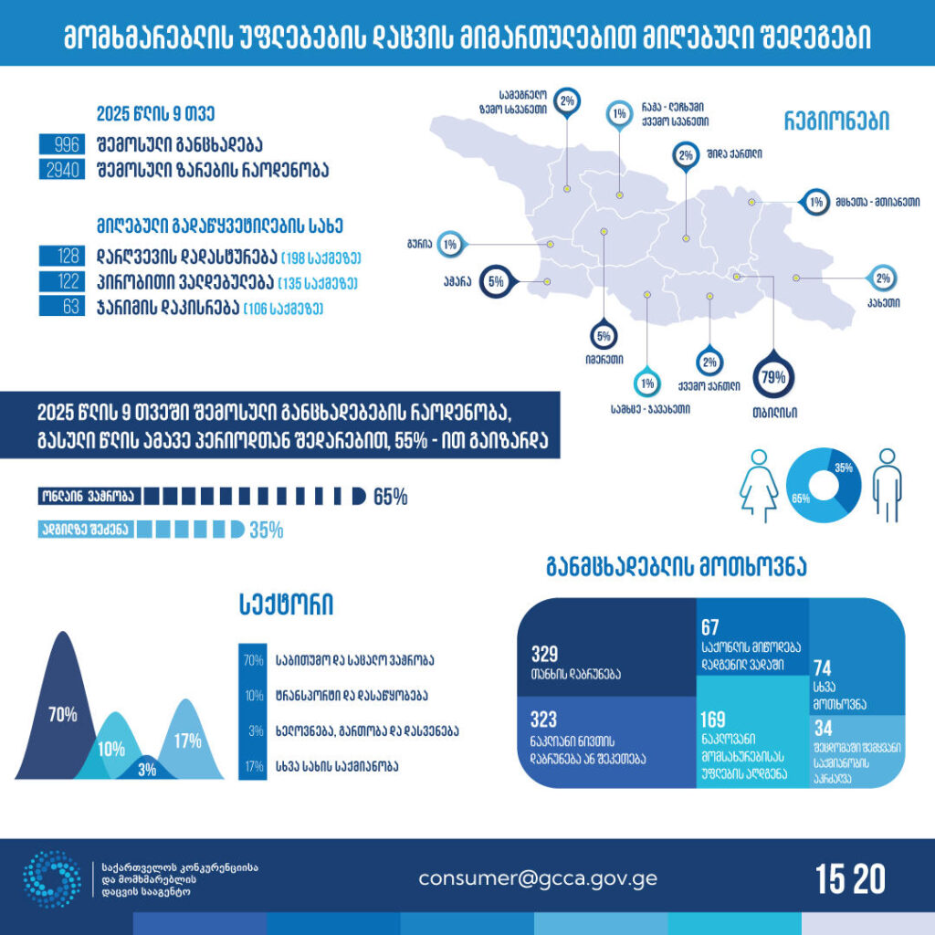 „მომხმარებლის უფლებების დაცვის მიმართულებით, მიმდინარე წლის 9 თვეში, GCCA-ში – 996 განაცხადი დაფიქსირდა, ხოლო შემოსული ზარების რაოდენობამ 2940 შეადგინა.