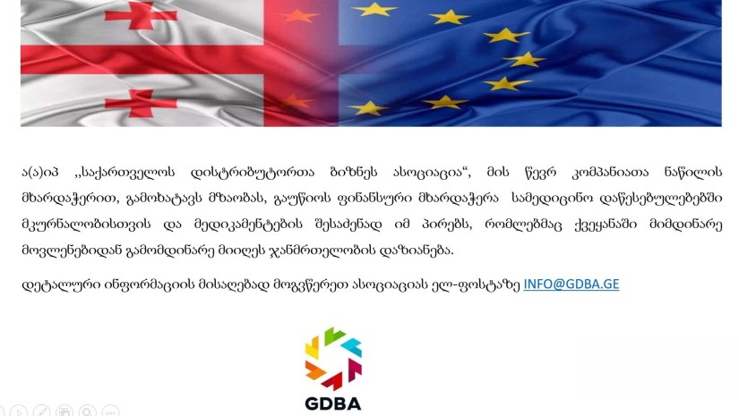 ,,საქართველოს დისტრიბუტორთა ბიზნეს ასოციაცია“ მზაობას გამოხატავს ფინანსური მხარდაჭერა გაუწიოს სამედიცინო დაწესებულებებში მკურნალობისთვის და მედიკამენტების შესაძენად იმ პირებს, რომლებმაც ქვეყანაში მიმდინარე მოვლენების შედეგად დაზიანდნენ. ინფორმაციას ასოციაცია საკუთარი სოციალური ქსელის დახმარებით ავრცელებს.