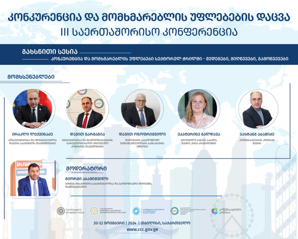 20-22 ნოემბერს, კონკურენციის პოლიტიკის აღსრულების და მომხმარებლის უფლებების დაცვის შესახებ III საერთაშორისო კონფერენცია – კონკურენციისა და მომხმარებლის დაცვის სააგენტოს, ეროვნული ბანკის, სემეკის, დაზღვევის სახელმწიფო ზედამხედველობის სამსახურის და კომუნიკაციების კომისიის ერთობლივი ორგანიზებით იმართება.