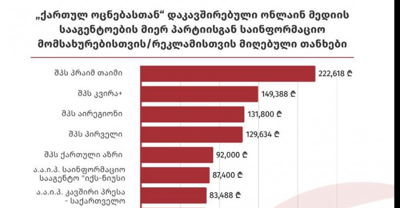 სამართლიანი არჩევნების მოკვლევის თანახმად, ქართულმა ოცნებამ 2019-2025 წლებში ონლაინ მედიის 22 კომპანიას ჯამში 1 503 708 ლარი გადაუხადა.
