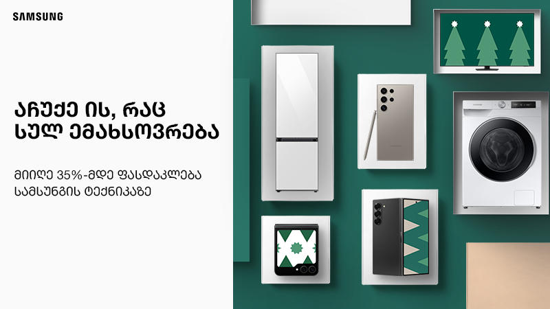 ახალი წლისთვის დასამახსოვრებელი საჩუქრების სიის შედგენა უკვე დაიწყე? ეწვიე Samsung-ის პარტნიორ მაღაზიებს 31 დეკემბრის ჩათვლით და შეარჩიე Samsung-ის საყოფაცხოვრებო და სმარტ ტექნიკა 35%-მდე ფასდაკლებით.