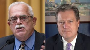 კონგრესმენები, დემოკრატი ჯერი კონოლი და რესპუბლიკელი მაიკ ტერნერი მიესალმებიან პრეზიდენტ