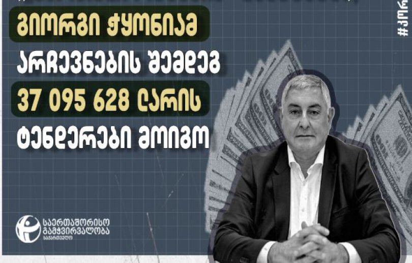 საერთაშორისო გამჭვირვალობა – საქართველოს ცნობით, ქართული ოცნების ოლიგარქმა დეპუტატმა გიორგი ჭყონიამ 2024 წლის საპარლამენტო არჩევნების შემდეგ 37 მილიონი ლარის ტენდერები მოიგო.