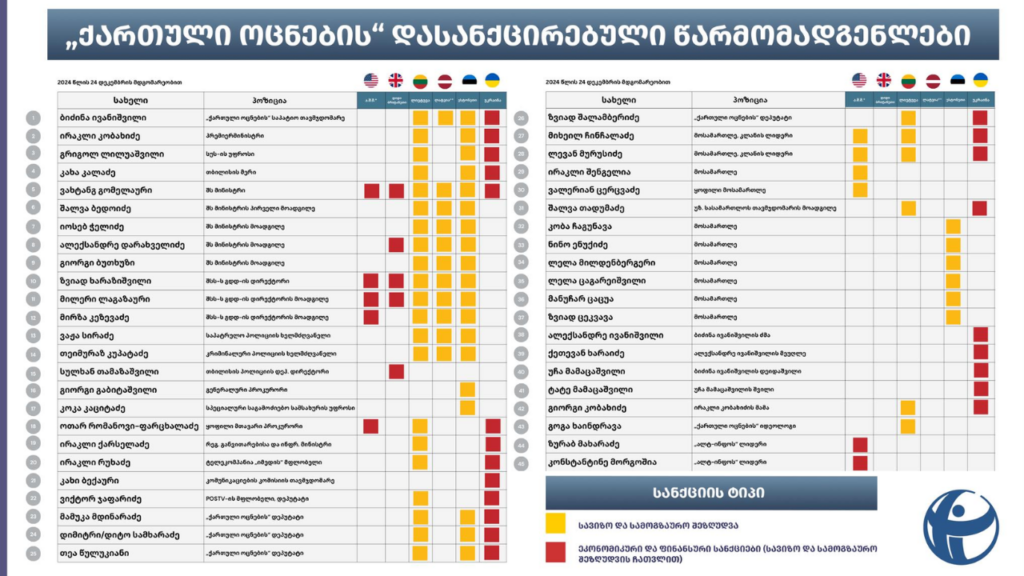დასავლურმა სამყარომ „ქართული ოცნების“ 150-ზე მეტი წარმომადგენელი უკვე დაასანქცირა, რომელთაგან 45-ის ვინაობა გასაჯაროვდა, ხოლო დანარჩენებზე ანონიმური სავიზო შეზღუდვებია დაწესებული და მათი ვინაობა უცნობია.