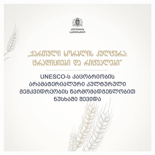 UNESCO-მ „ქართული ხორბლის კულტურა: ტრადიციები და რიტუალები“ კაცობრიობის არამატერიალური კულტურული მემკვიდრეობის წარმომადგენლობით ნუსხაში შეიტანა. ინფორმაციას საქართველოს კულტურის სამინისტრო ავრცელებს.